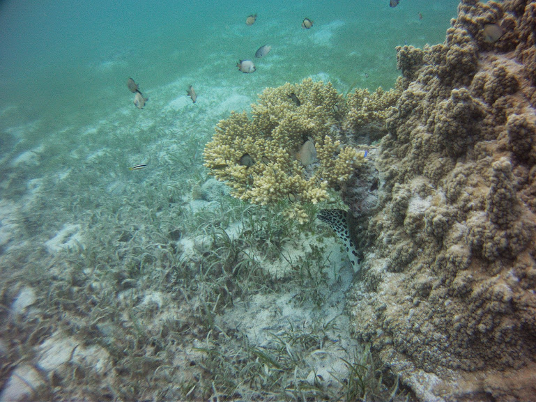 Un banc de baracuda, une murène blanche tachetée de noir, des poissons trompette, et des coraux intacts. Que du bonheur.